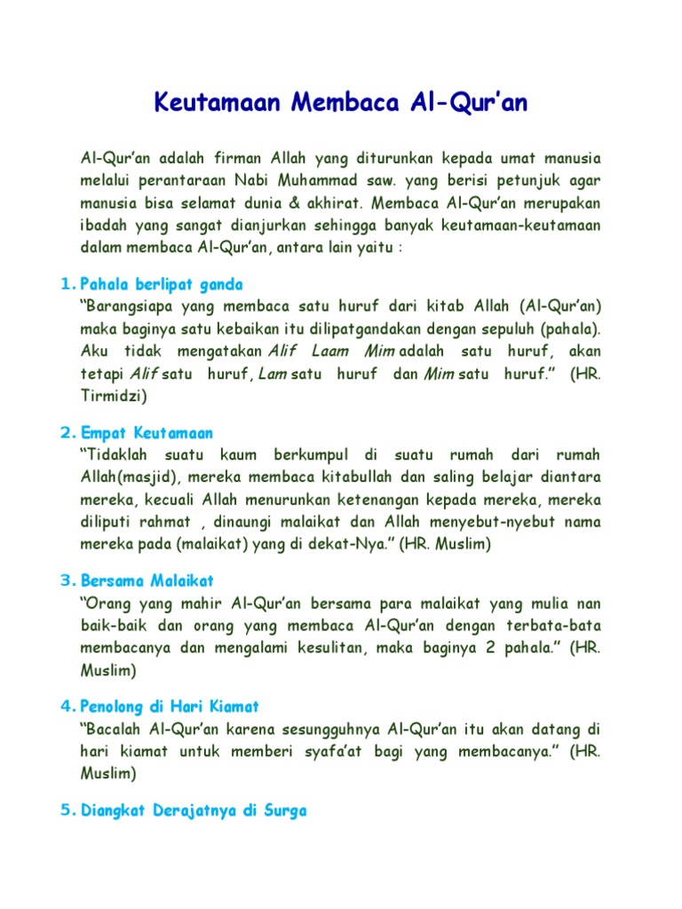 Membaca Al Quran merupakan langkah pertama dalam berinteraksi dengannya dan untuk mengairahkan serta menghidupkan kembali kegairahan kita dalam membaca Al Quran kami sampaikan beberapa keutamaan membaca Al Quran sebagai berikut. Membaca Al Quran merupakan langkah pertama dalam berinteraksi dengannya dan untuk mengairahkan serta menghidupkan kembali kegairahan kita dalam membaca Al Quran kami sampaikan beberapa keutamaan membaca Al Quran sebagai berikut. Selain mengarahkan kita ke jalan yang benar Al-Quran memiliki banyak keutamaan bagi orang yang membacanya.